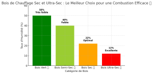 Découvrez comment l’humidité du bois de chauffage influence sa performance. Ce graphique vous aide à comprendre les différents taux d’humidité du bois, de « bois vert » très humide à « bois ultra-sec » parfaitement adapté à une combustion optimale. Plus le bois est sec, plus la combustion est efficace, avec un rendement énergétique maximal et un impact minimal sur l’environnement. Ce visuel vous permet de comparer les différents types de bois et de faire le choix le plus adapté à vos besoins pour un chauffage économique et respectueux de l’environnement.